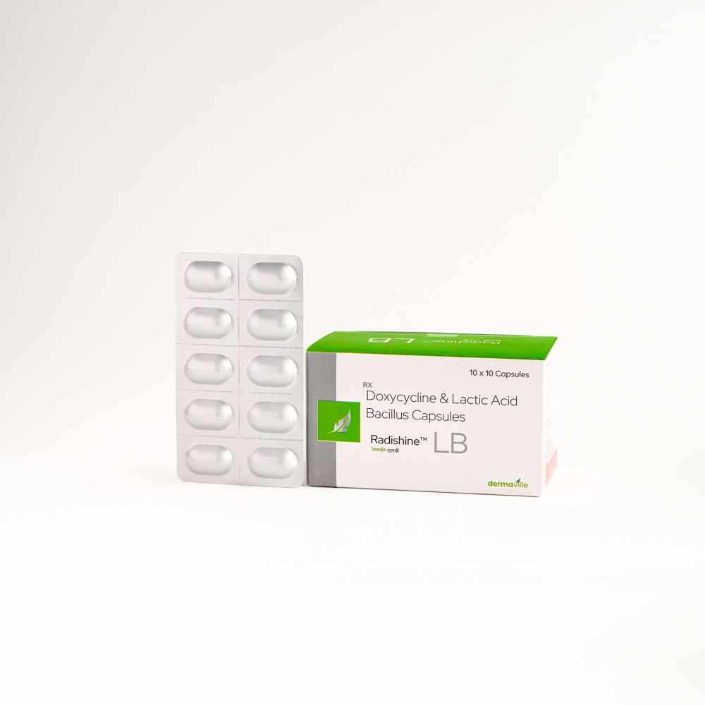 Doxycycline & Lactobacillus capsules are manufactured and supplied by Dermaville under the brand name Radishine LB. They offer a powerful dual-action formula designed to combat bacterial infections while supporting gut health. Each capsule combines Doxycycline, a broad-spectrum antibiotic effective against acne, respiratory infections, and urinary tract infections, with Lactobacillus, a probiotic that helps maintain healthy intestinal flora and reduces antibiotic-associated side effects like diarrhea.
